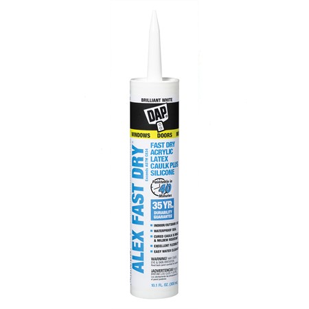 DAP ALEX FAST DRY ACRYLIC LATEX CAULK PLUS SILICONE is ideal for projects that require painting shortly after caulk application. In about 30 minutes, the caulk forms a tough outer skin that’s dry enough to paint over with both water and oil based paints cutting standard waiting times by 90mins (allow longer in cool or humid conditions). It provides a durable indoor and outdoor caulking product with a waterproof, resilient seal designed to prevent air and moisture from passing through cracks and joints. Delivering excellent flexibility to resist expansion and contraction without cracking. Easy to use, low odour and VOC it is ideal for windows, doors, eaves, baseboards, pipes, moulding, vents, siding/trim, corner joints and ducts. It will adhere to most common building materials including wood, brick, GIB, metal, concrete, plaster, glass, and painted surfaces.